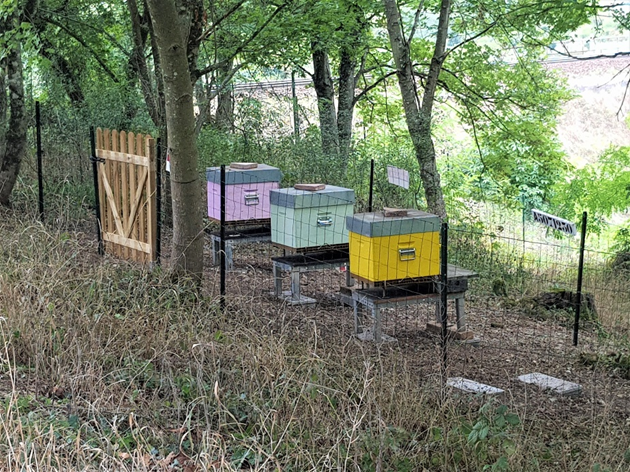 ça y est, les ruches sont installées dans le vallon et nous adressons tous nos remerciements à Colette et Gilles Gaillard, nos apiculteurs qui ont réalisé un travail formidable ! Ils ont créé pour les abeilles un petit coin sécurisé à l’ombre des arbres. Un bel endroit presque douillet d’où elles prennent déjà leur envol. Merci